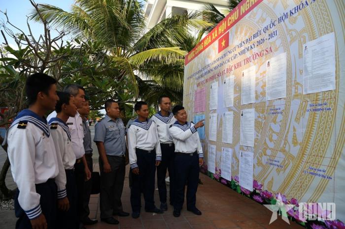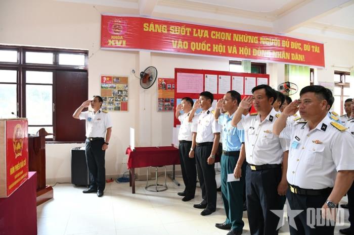 Trong không khí trang trọng, ngay từ sáng sớm trước giờ bầu cử, cán bộ, chiến sĩ và nhân dân đang sinh sống, công tác tại Trường Sa nghiêm trang thực hiện nghi thức chào cờ. Giữa biển trời bao la, bài Quốc ca trầm hùng vang lên khiến lòng người bừng bừng khí thế. Ngày hội lớn của toàn dân chính thức bắt đầu.