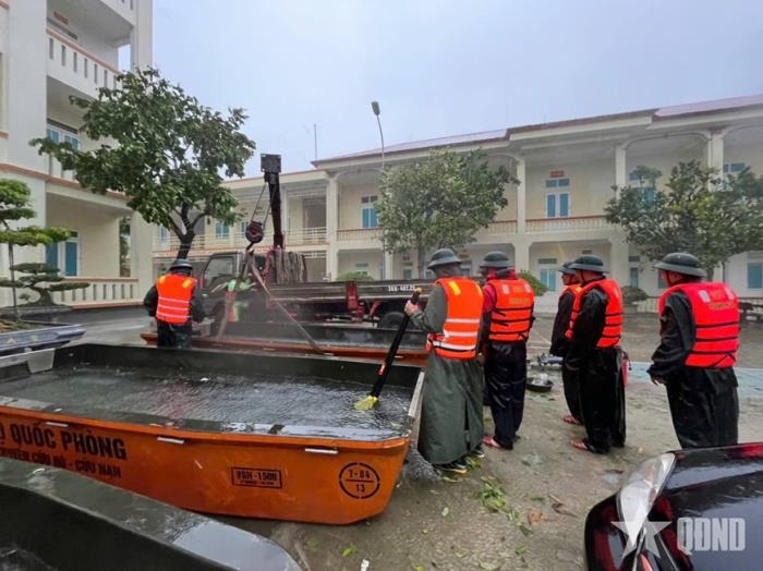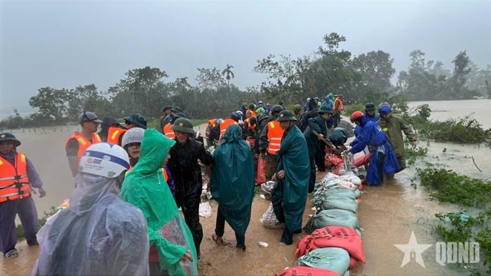 VBĐVN.vn - Sáng 29-9, Thượng tá Nguyễn Văn Tuấn, Chỉ huy trưởng Ban chỉ huy Phòng thủ Khu vực 5 - Tĩnh Gia (Bộ CHQS tỉnh Thanh Hóa) cho biết: Từ rạng sáng, mưa bão kết hợp triều cường đã làm tràn tuyến đê sông Thị Long, phường Ngọc Sơn (Thanh Hóa). Đơn vị đã huy động gần 100 cán bộ, chiến sĩ phối hợp cùng cấp ủy, chính quyền và lực lượng tại chỗ của địa phương tham gia hộ đê.