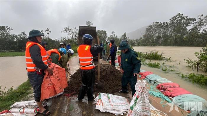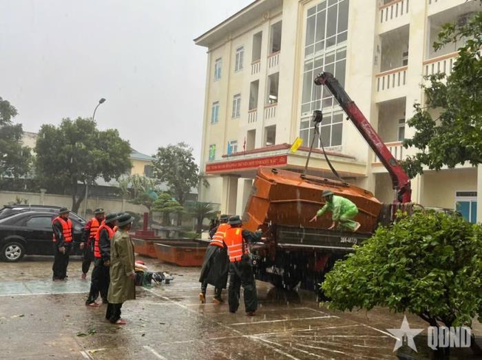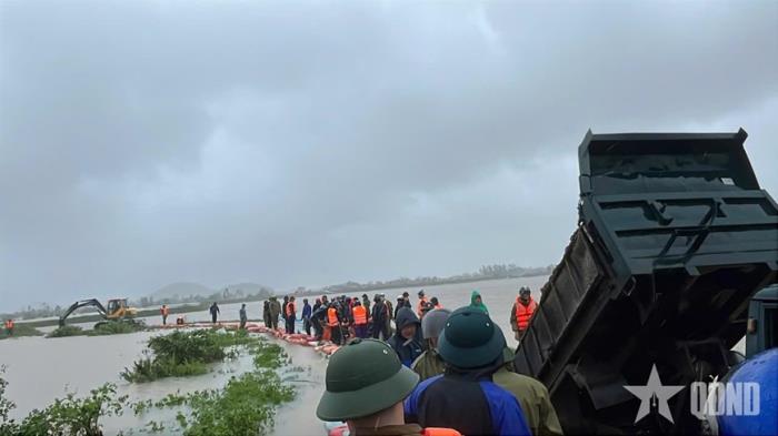 Đến 11 giờ ngày 29-9, hoạt động hộ đê sông Thị Long vẫn đang được cán bộ, chiến sĩ Ban chỉ huy Phòng thủ Khu vực 5 - Tĩnh Gia tiến hành khẩn trương, quyết tâm bảo đảm an toàn cho gần 2.000 hộ dân cùng tài sản hoa màu phía nội đê.