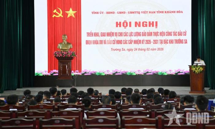 VBĐVN.vn - Ngày 24-2, đồng chí Hồ Xuân Trường, Ủy viên dự khuyết Trung ương Đảng, Phó bí thư Thường trực Tỉnh ủy, Bí thư Đảng ủy các cơ quan Đảng tỉnh Khánh Hòa đã chủ trì hội nghị triển khai, giao nhiệm vụ cho các lực lượng bảo đảm công tác bầu cử sớm đại biểu Quốc hội khóa XVI và đại biểu Hội đồng nhân dân (HĐND) các cấp nhiệm kỳ 2026 - 2031 tại Đặc khu Trường Sa.
